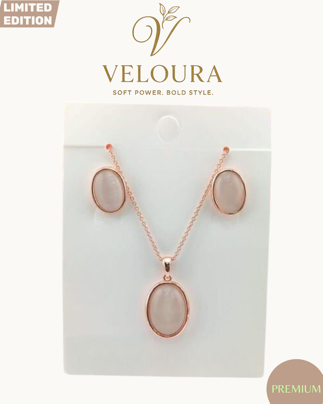Soft, feminine glow you can wear every day. Smooth blush-toned cabochons sit in slim rose-gold–tone bezels, with a matching pendant and stud earrings that feel polished without trying too hard. The delicate cable chain drapes comfortably, and the studs sit neatly on the lobe for an easy, put-together look.