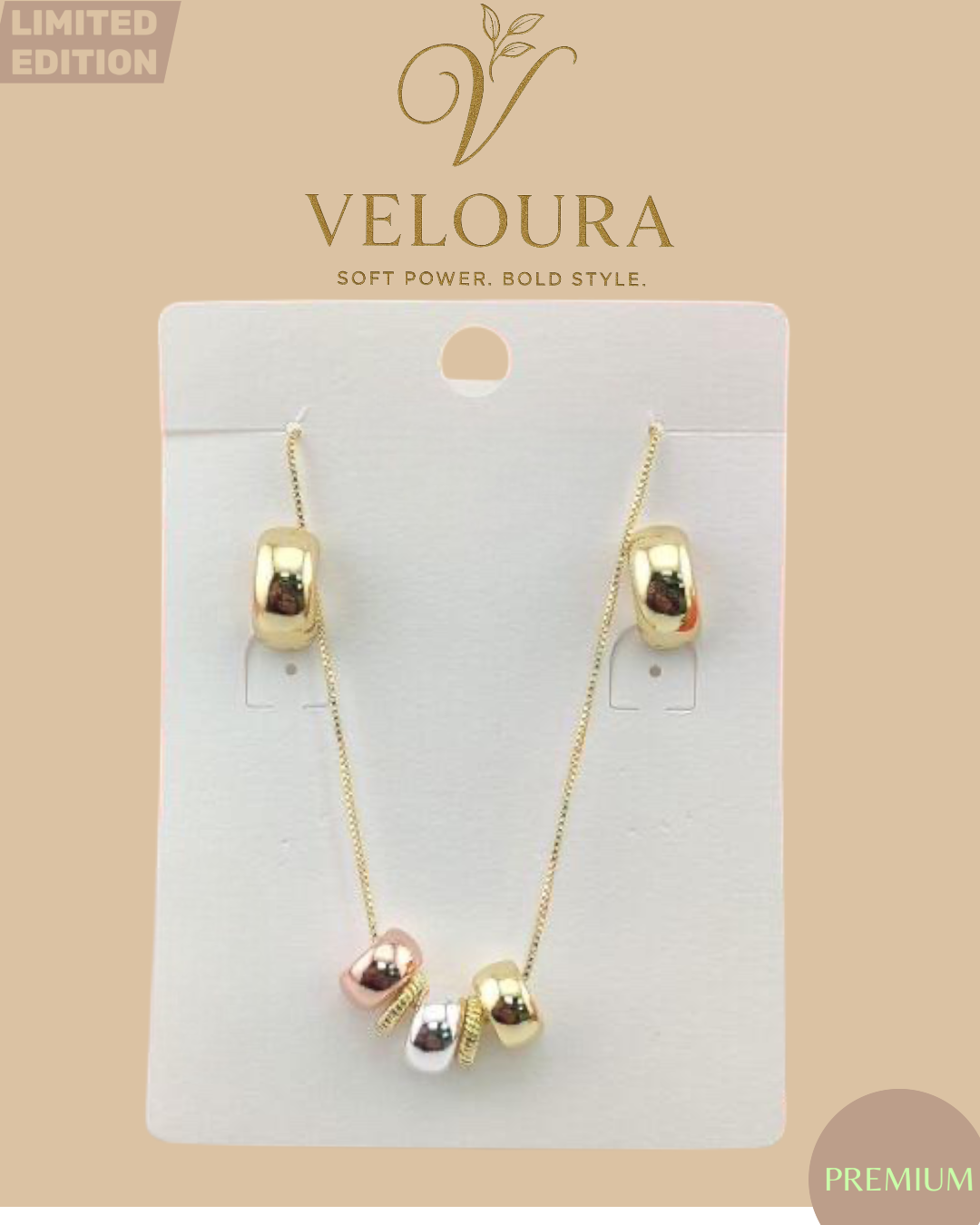 Polished barrel beads in rose, silver, and gold tones gather at the center of a fine gold chain. Two slim textured spacers add a hint of sparkle. Matching gold mini huggie earrings echo the smooth pebble shape and sit close to the lobe. Clean, modern, and easy for every day.