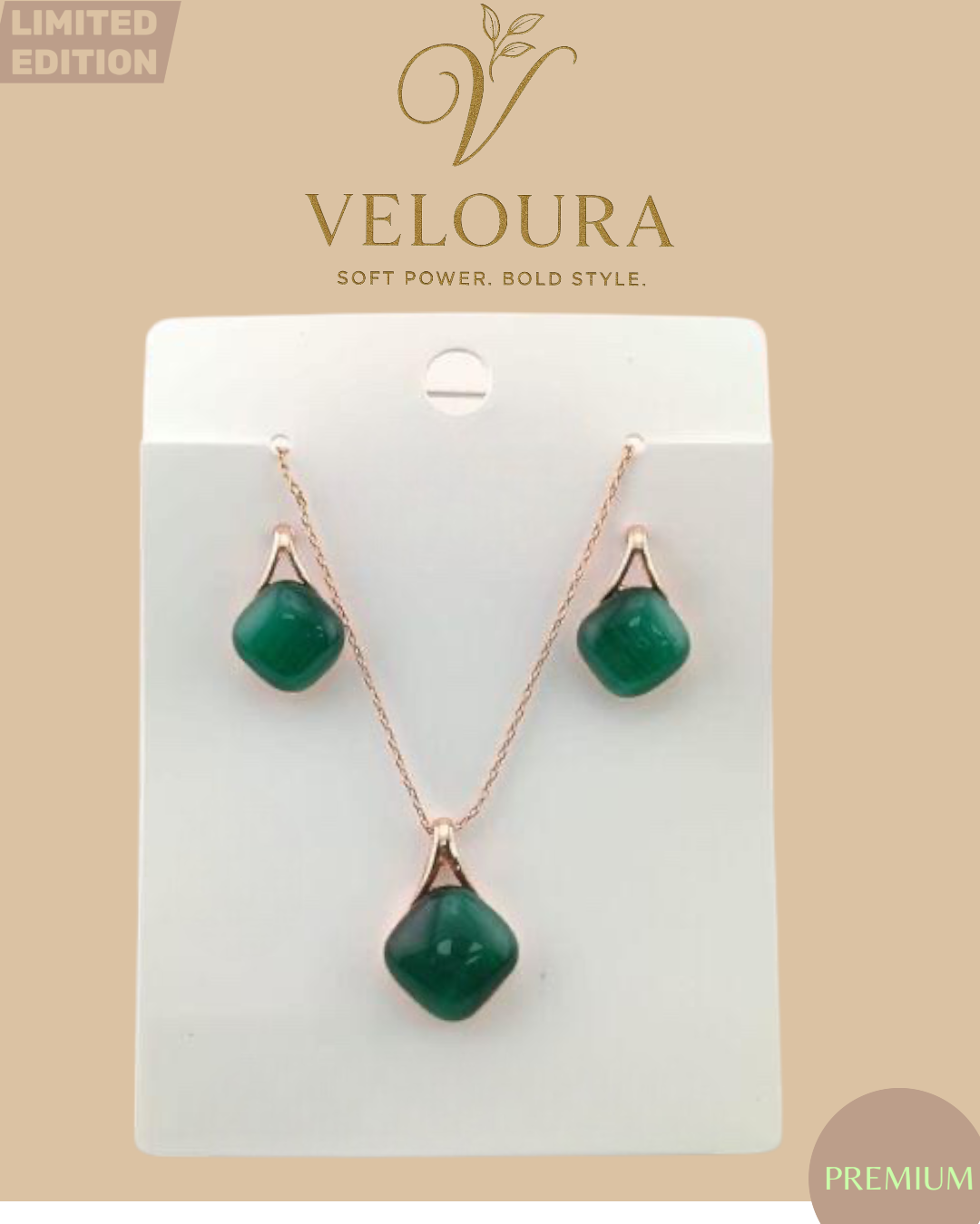 Smooth, glossy green cushion stones are cradled in a slim rose-gold tone cap. The pendant sits on a fine chain and the matching studs sit neatly on the lobe. Clean color, easy polish.