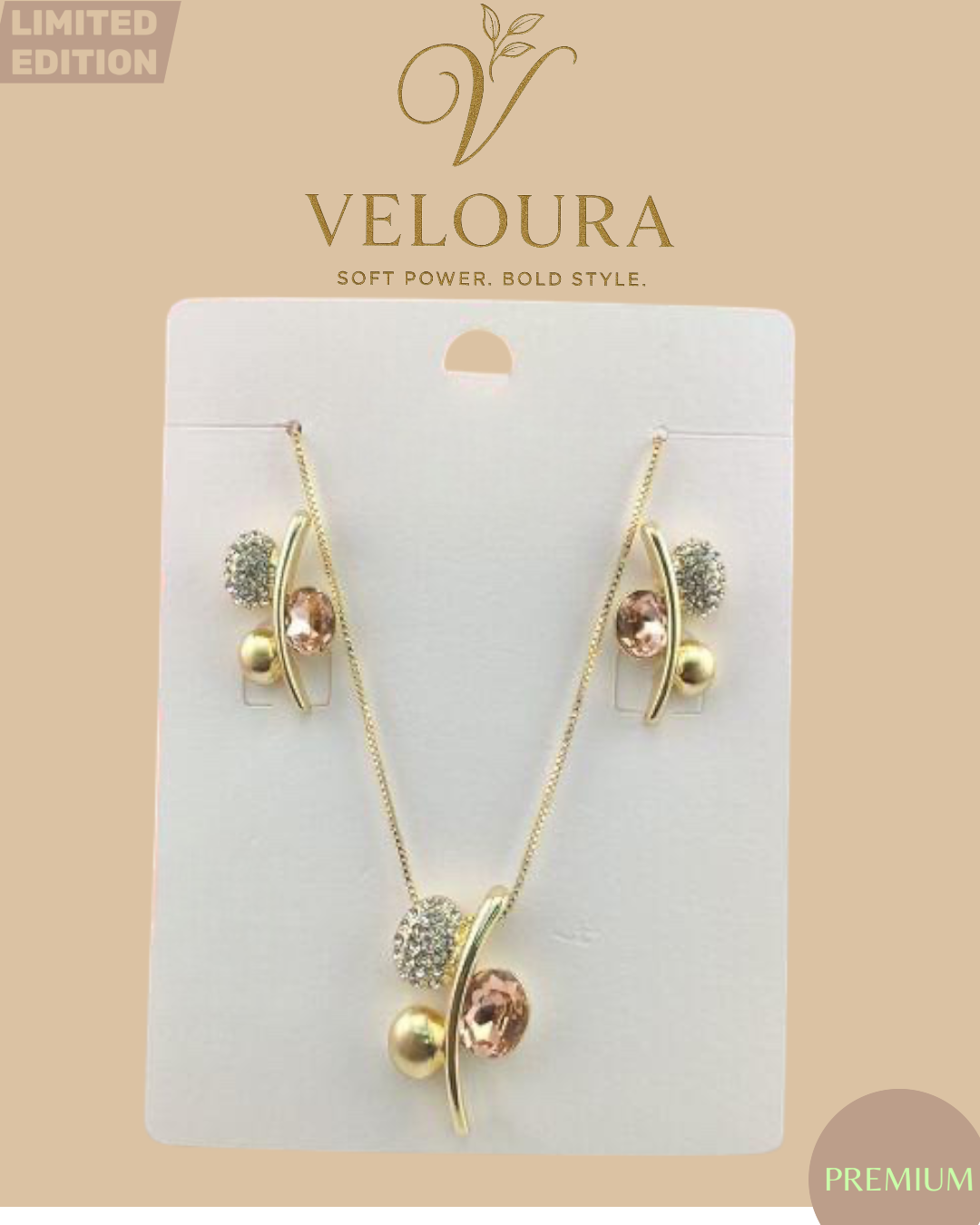A polished gold chain frames a sculptural cluster at center. Sparkly pavé ball, faceted blush orb, and satin gold bead are hugged by a sleek curved bar for light-catching dimension. Matching drop earrings mirror the same mixed-bead motif for an easy, coordinated finish.
