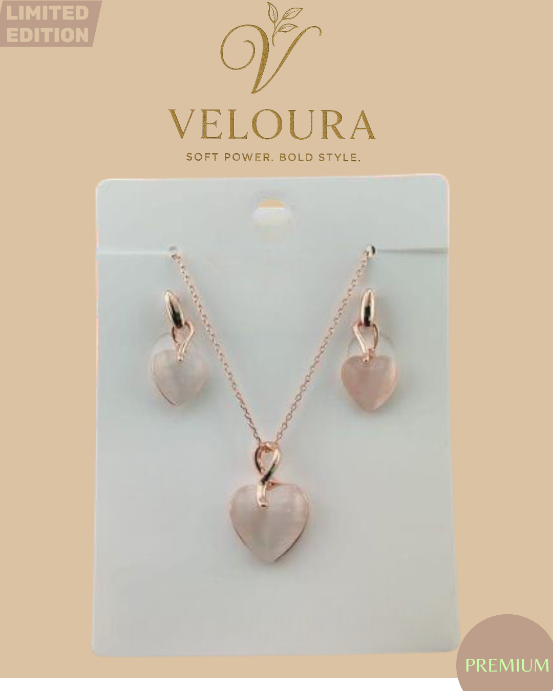 Sweet, simple and ready to gift. A smooth blush heart cabochon is cradled in a slim rose-gold tone cap and hangs from a fine chain. Matching mini drop earrings echo the same heart motif for a clean, coordinated look.