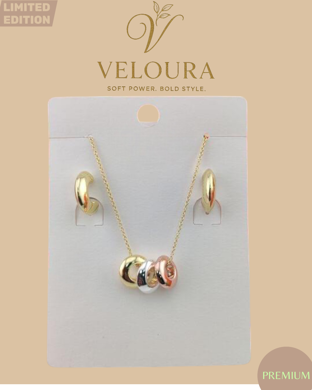 Classic mixed-metal shine. Four smooth ring charms in gold, silver, and rose slide at the center of a fine gold-tone chain. Matching chunky mini hoops sit close to the lobe for a clean, everyday finish.