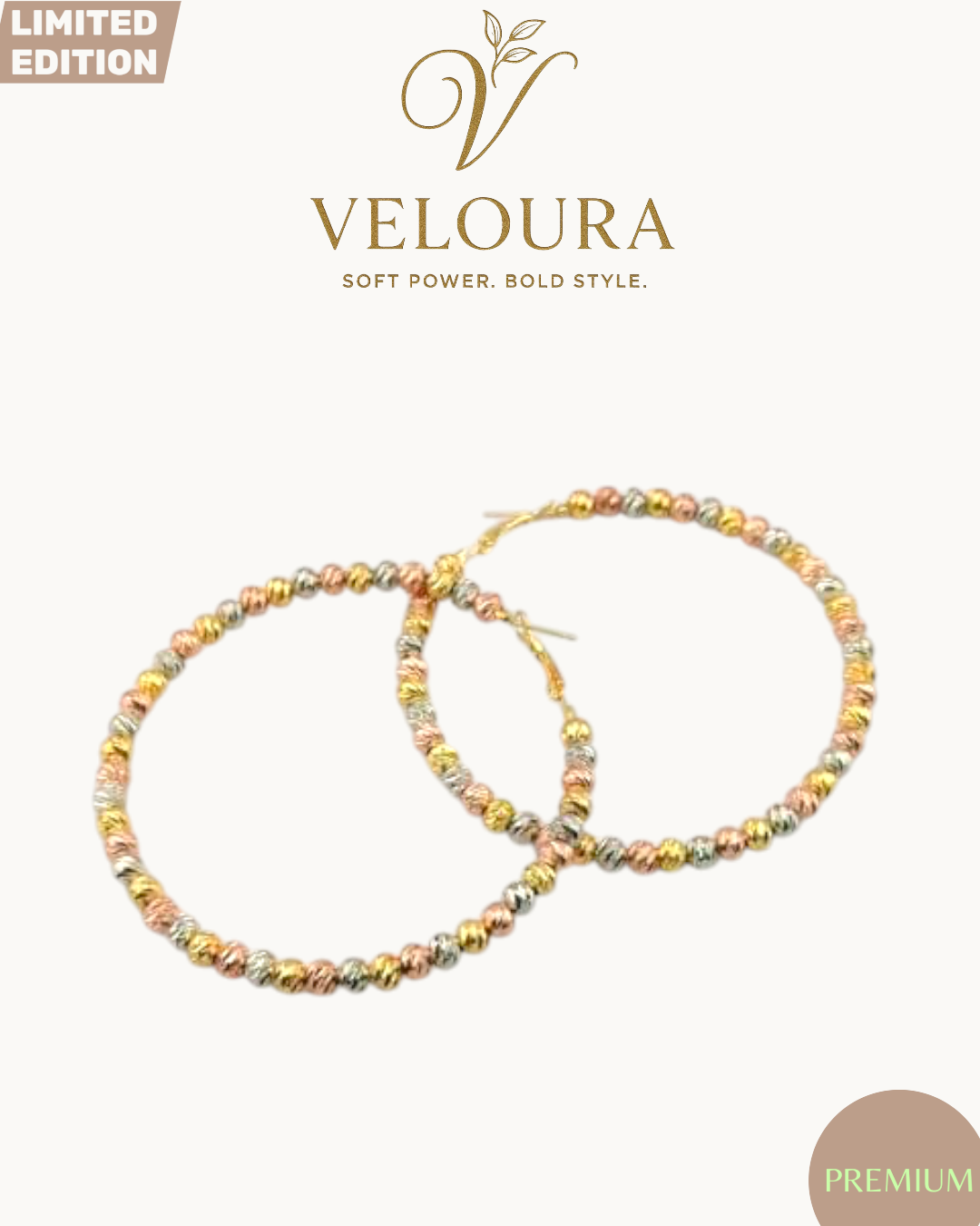 Easy shine with a little playful detail. These hoops are lined with tiny corrugated beads in a trio of finishes—warm gold, soft rose, and cool silver—so they catch light from every angle and style with anything in your closet. Slim, balanced, and comfortable for all-day wear, they close with a simple latch that stays put.
