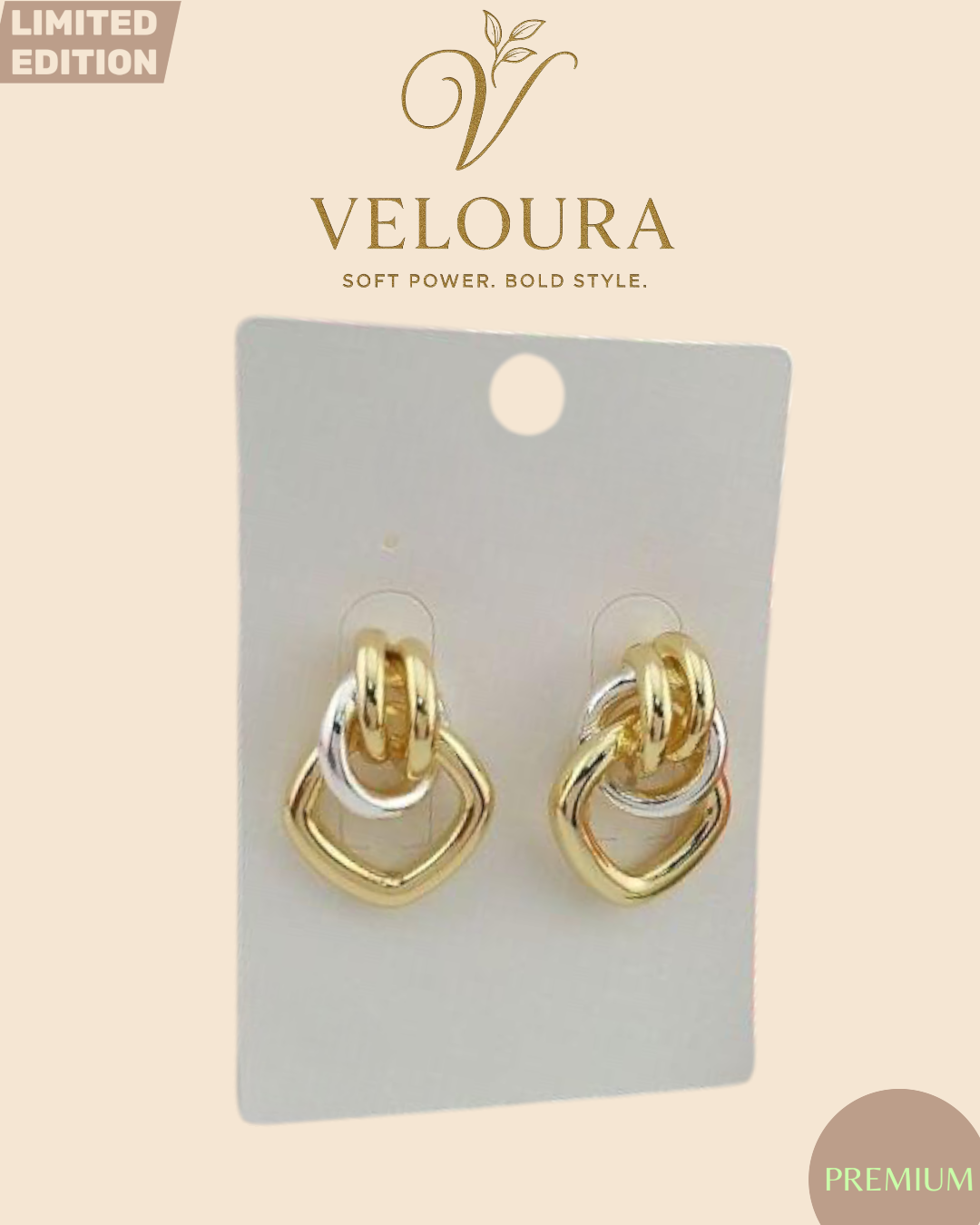 Small, sculptural, and easy to style. Polished gold-tone and silver-tone links are stacked and interlocked, finished with a soft diamond-shaped drop that frames the lobe. The mixed metals make pairing simple—wear with gold, silver, or both. Lightweight and comfortable with a secure post back.