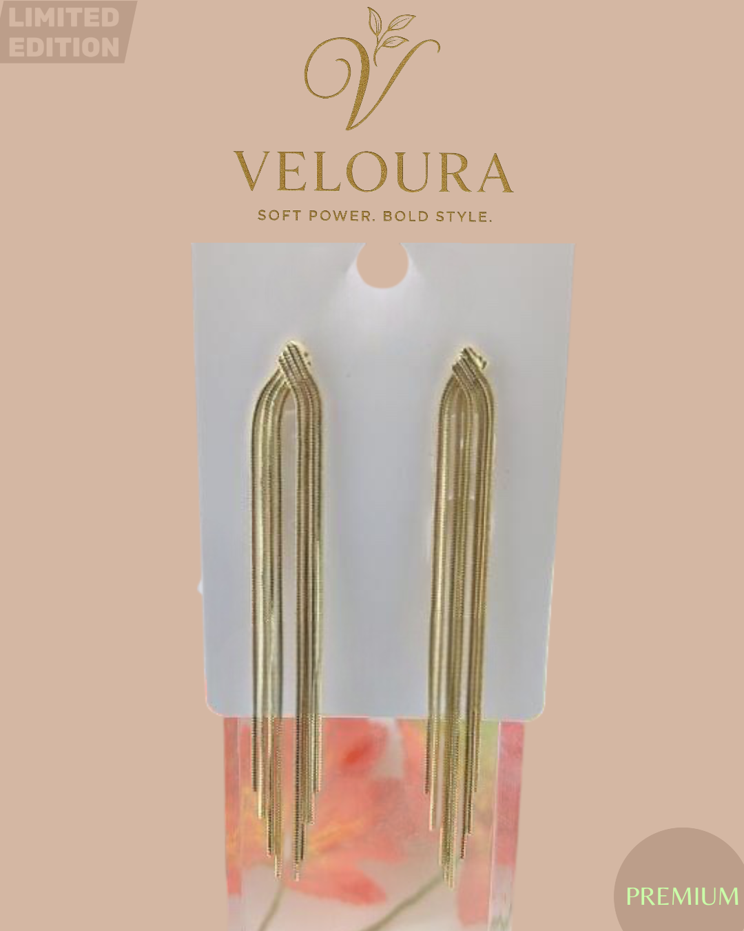 Slim, multi-strand chains loop from a polished cap and fall in clean, even lines for a sleek, swishy finish. Lightweight with big impact, they frame the face and move beautifully with every step.